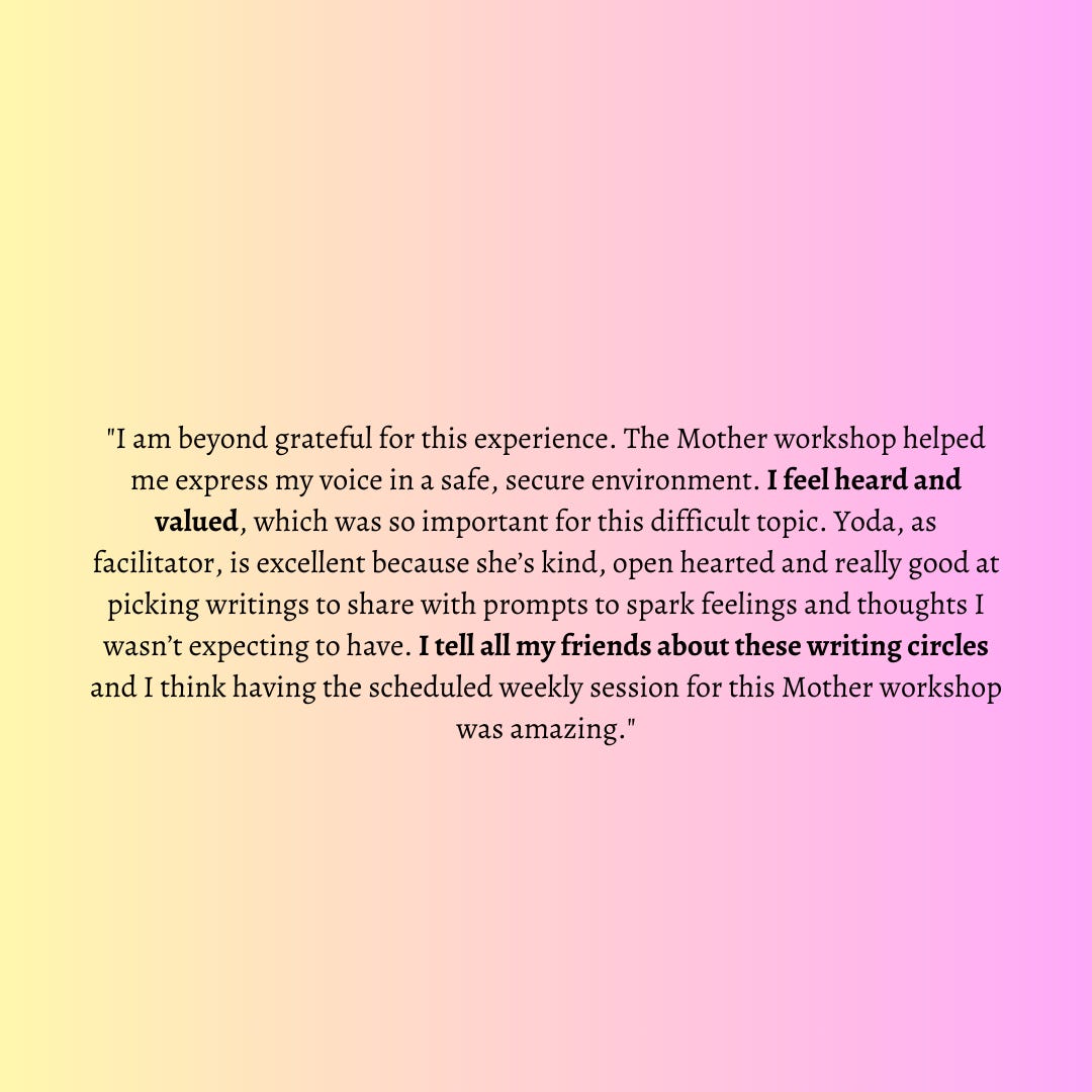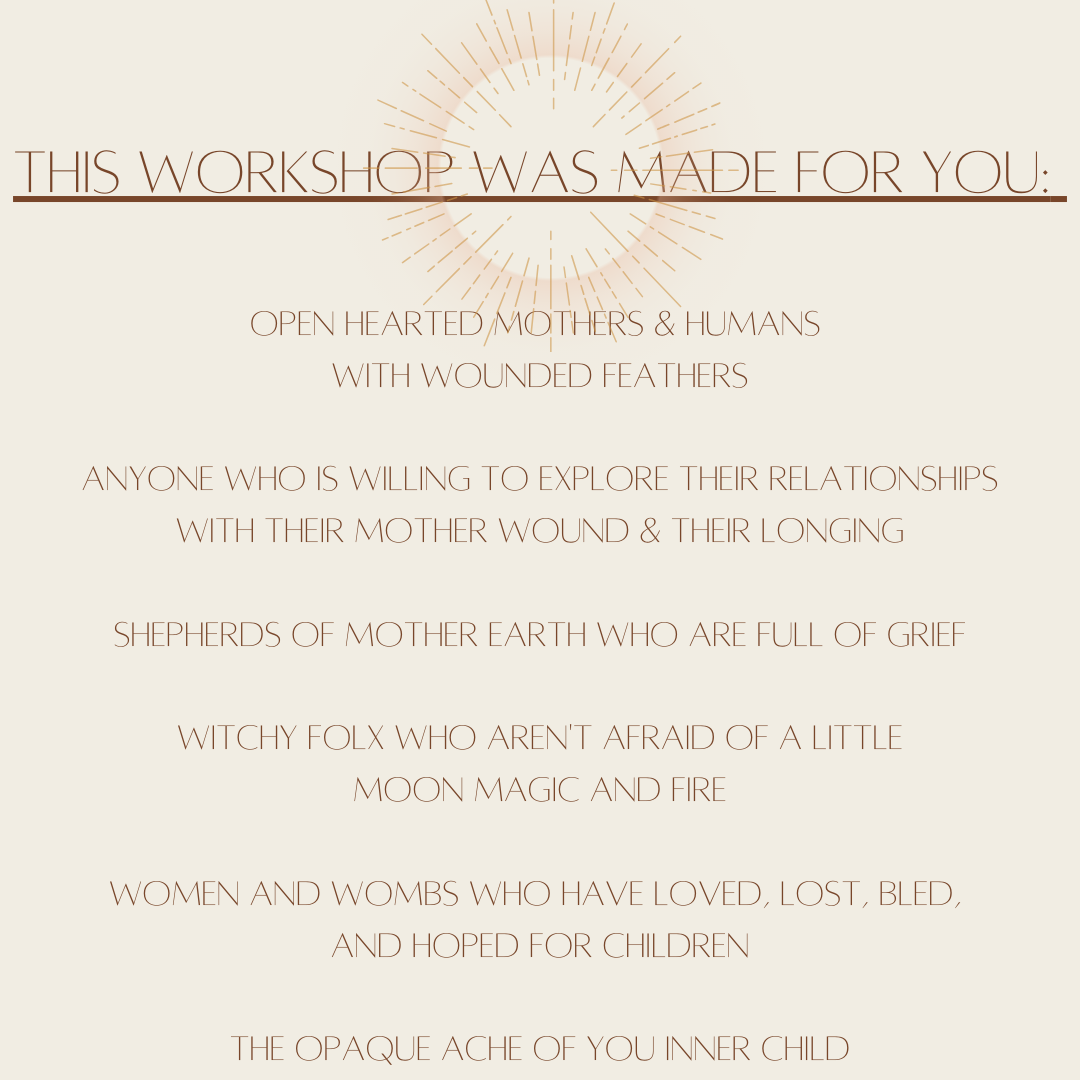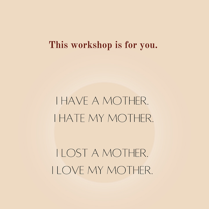 If you’re ready to explore your relationship to mother in all its forms, including wounds, this workshop is for you. I look forward to exploring it alongside you.
